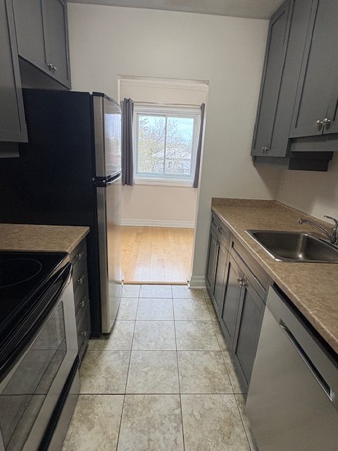 This unit includes five appliances, a new dishwasher, and in-suite laundry with a new dryer.